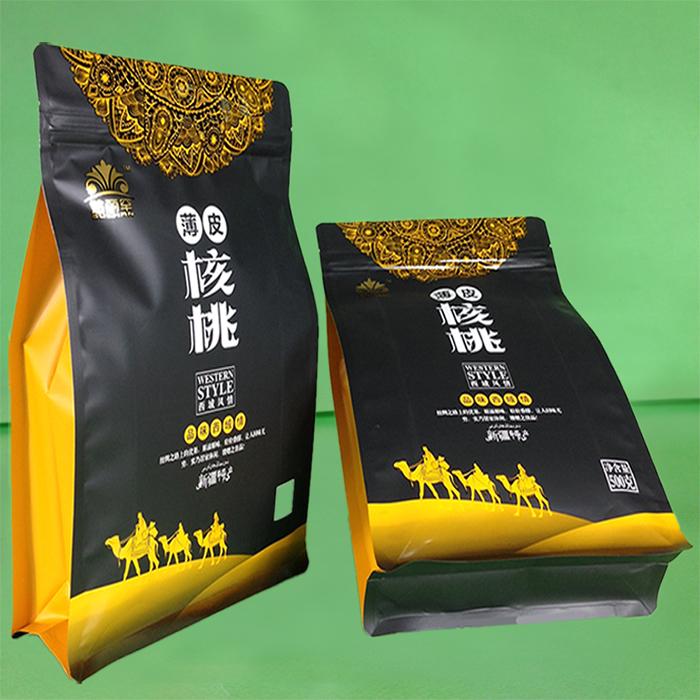 八邊封干果包裝袋(UV啞油印刷核桃包裝袋) 八邊封復(fù)合袋(飼料包裝袋) 八邊封平底包裝袋(UV啞油印刷麥片包裝袋)